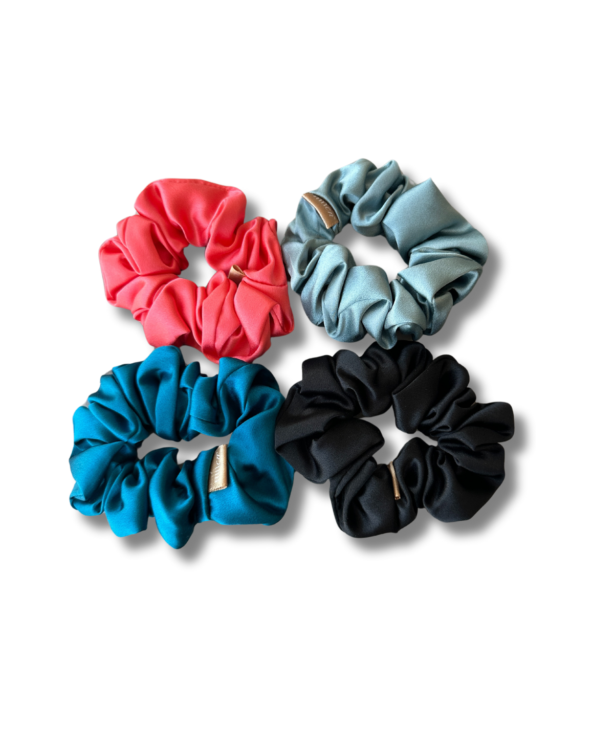 pack of 4 - includes 1 'coral' scrunchie & 1 'teal' scrunchie, 1 'indigo' scrunchie, 1 'midnight black' scrunchie!